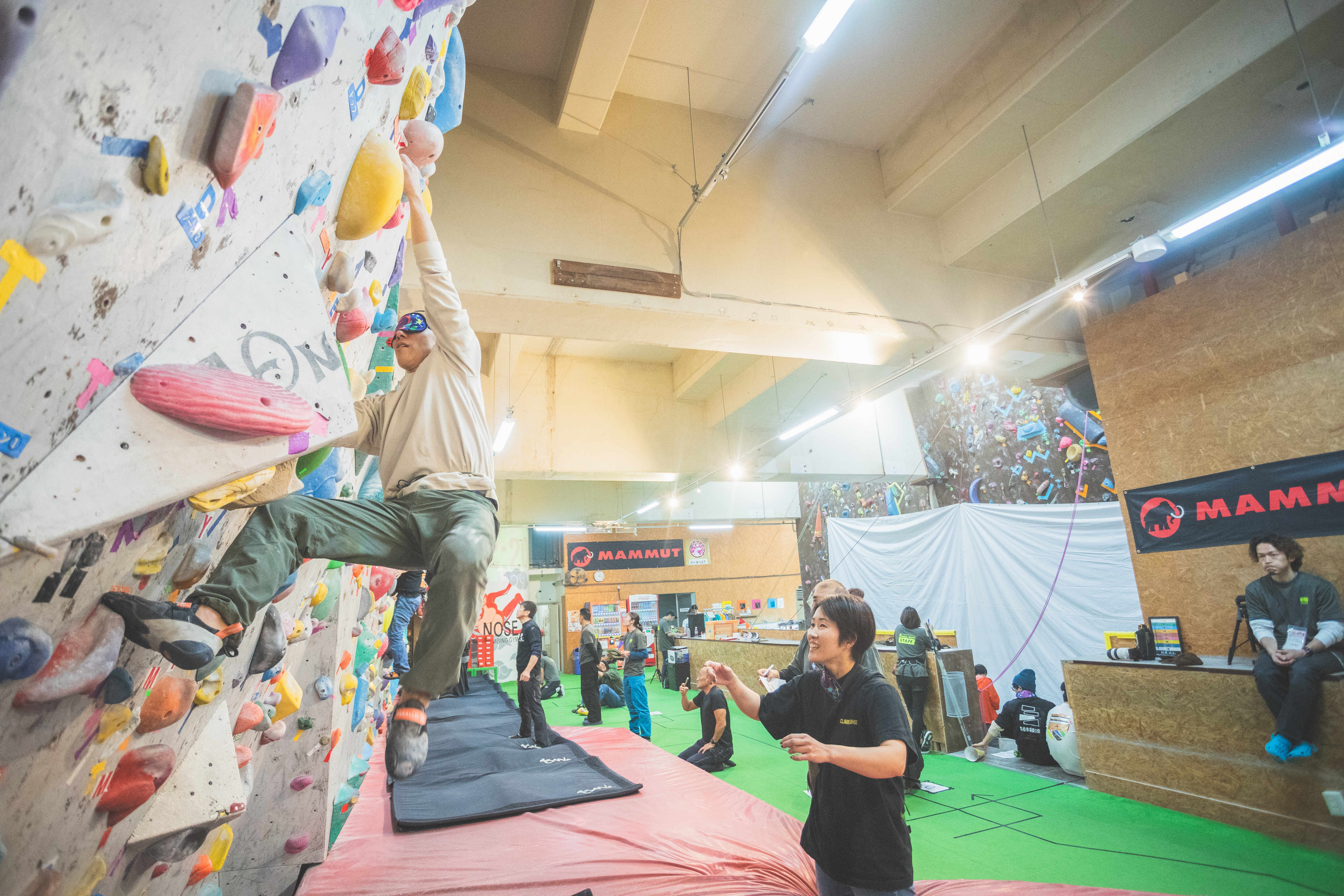 クライマーは壁を登り、サイトガイドがホールドの位置や形、距離を声で伝えます。二人一組で力を合わせる、ユニークなクライミングコンペです。